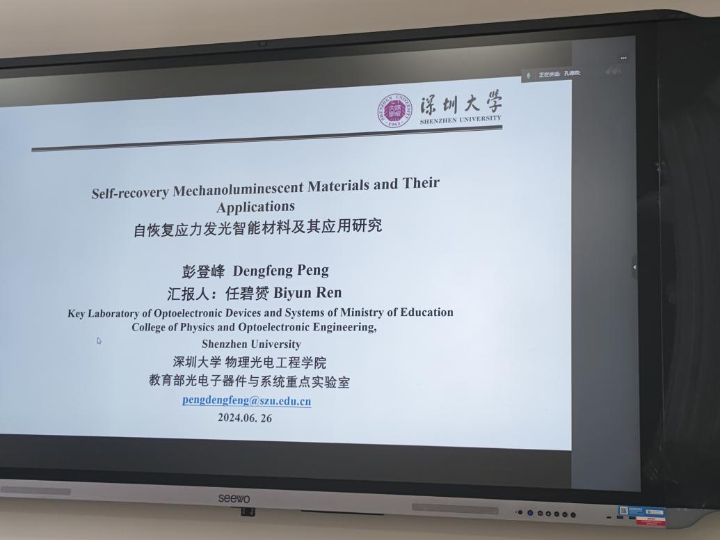 彭登峰研究员报告内容:自恢复应力发光材料及其应用研究。自恢复性(Self-recovery)应力发光特性半导体材料在可视化应力传感和智能无源显示器件领域表现出极为重要的应用前景。报告介绍通过材料结构组合设计和制备工艺条件优化,在异质结复合材料中实现了数十种稀土离子、过渡金属离子的有效掺杂和高亮度应力发光,极大的拓展了光谱范围,实现单一基质的紫外到近红外的全光谱仪应力发光,同时通过工艺条件优化提高发光强度,还降低了合成成本。基于所合成的应力发光材料,在阐明机理的同时,展示了其在工程应力/应变分布可视化成像、体育运动力监测、电子签名笔、应力发光节能显示地毯、机械力加密防伪和荧光棒等领域的应用。