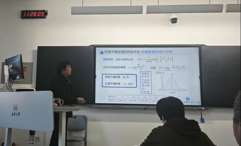 互动交流环节,多位老师结合自身物理实验教学实践,分享了对新版标准在课堂落地中的思考与应用思路,部分老师还就实验教学中遇到的难点问题——如数据处理中扩展不确定度的包含因子和有效自由度的计算与孙教授展开深入探讨,现场氛围热烈。孙教授逐一给予针对性解答,建议教师从实验设计环节融入新标准理念,并通过开放实践、个性化的实验课程体系等方式强化员工实践创新能力。