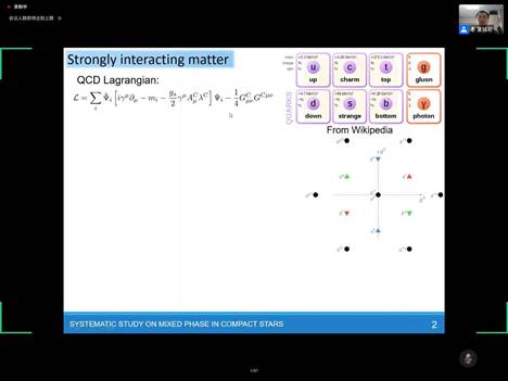 夏铖君教授的报告题目为:致密星内部夸克强子混合物质的系统研究,该报告使我们了解到现阶段对高密物质的研究现状,特别是夸克强子混合物质以及其与致密星结构和性质之间的联系,对于比较重的致密星,其内部极有可能存在夸克物质,对于存在夸克物质的致密星,夸克-强子界面效应对致密星的结构和性质存在重要影响。