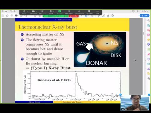 下午,Aira dohi 教授主讲内容为Numerical Modeling of a Clocked Burster GS1826-24 with the physics inside Accreting Neutron Stars.