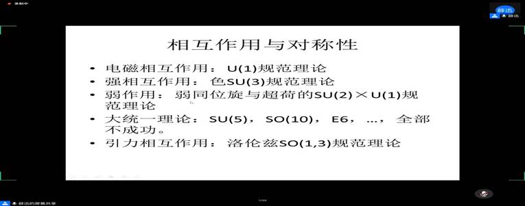 紧接着薛讯教授向参会师生讲述了“从对称性谈起”的报告,报告从相对论和量子力学等多个角度提出了“对称性在现代物理学中发挥着巨大作用,在过去的一个世纪中,对称性的应用贯穿了物理学的主旋律,面对基础物理学新的挑战,以暗物质和暗能量为代表的物理学天空新的两朵乌云,对称性还有可能再次发挥重要作用吗?”的问题,并且对该问题做出了初步的解释回答,同时也引起了参会员工的积极反思。