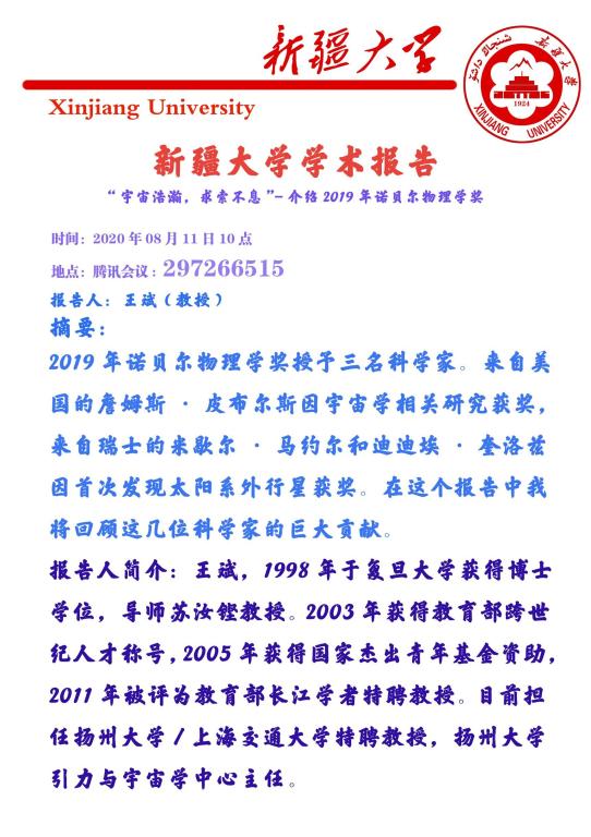 报告题目: “宇宙浩瀚,求索不息”-介绍2019年诺贝尔物理学奖