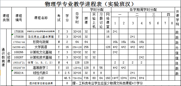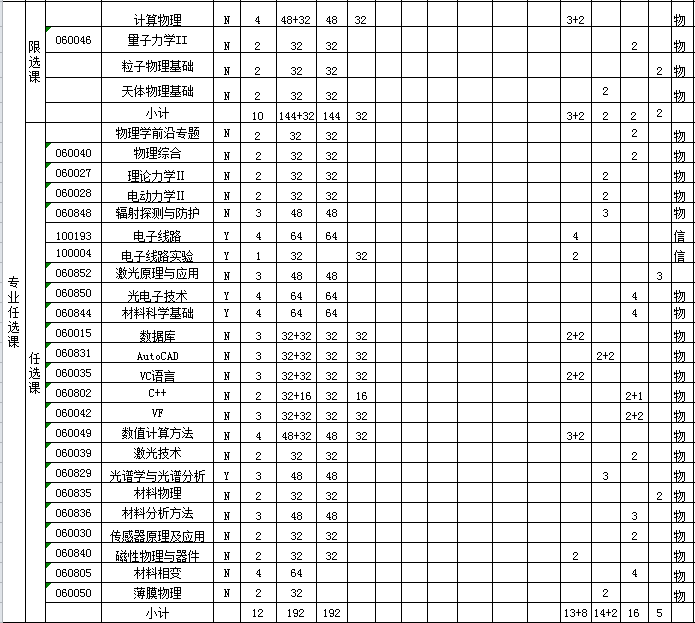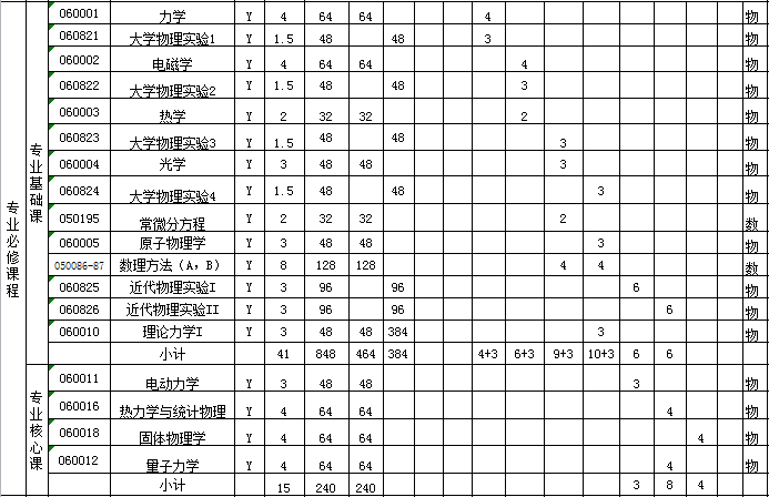 力学、热学、光学、电磁学、原子物理学、理论力学、常微分方程、数理方法A、数理方法B、大学物理实验、近代物理实验、电动力学、热力学与统计物理、量子力学、固体物理学