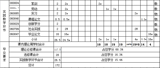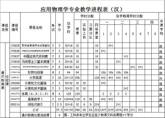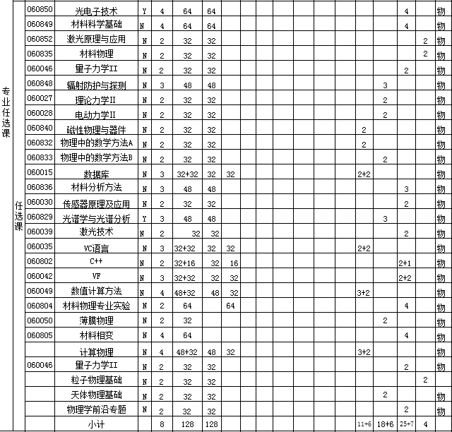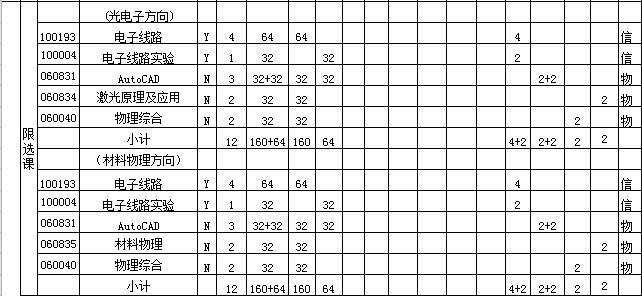 力学、热学、光学、电磁学、原子物理学、理论力学、常微分方程、数理方法A、数理方法B、大学物理实验、电动力学、近代物理实验、固体物理学、光电子技术、材料科学基础